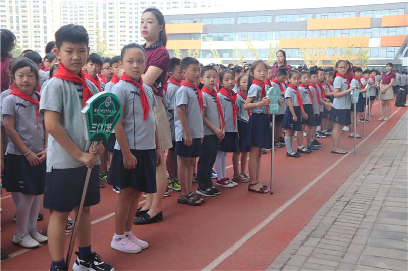 國歌奏響,隊歌嘹亮。少先隊員們隊列標準,身姿規(guī)范。